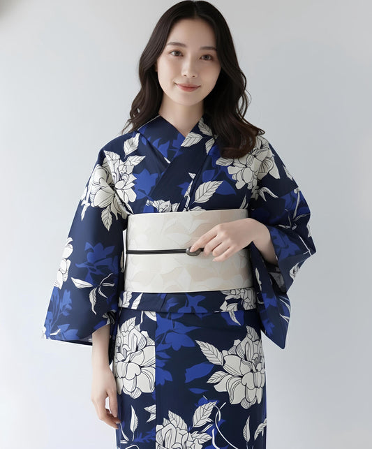 Navy Blue Floral Japanese Cotton Yukata Set with Obi Belt, Obijime, Geta Sandals, Custom Fit Available