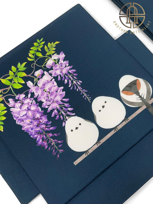 Hokkaido Long-tailed Tit (or Shima-enaga) Pre-Tied Taiko Knot, Easy Wear Nagoya Obi, Two-Side Sash