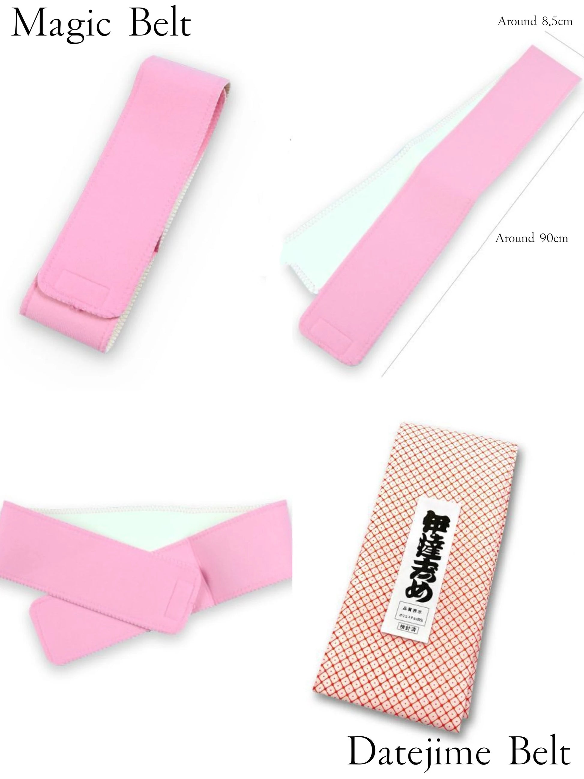Date-jime is the second belt to tie around the waist over Koshi Himo first belt (before Obi belt) to hold Nagajuban and Kimono in place. If the datejime has a velcro closer, it is also celled magic belt.