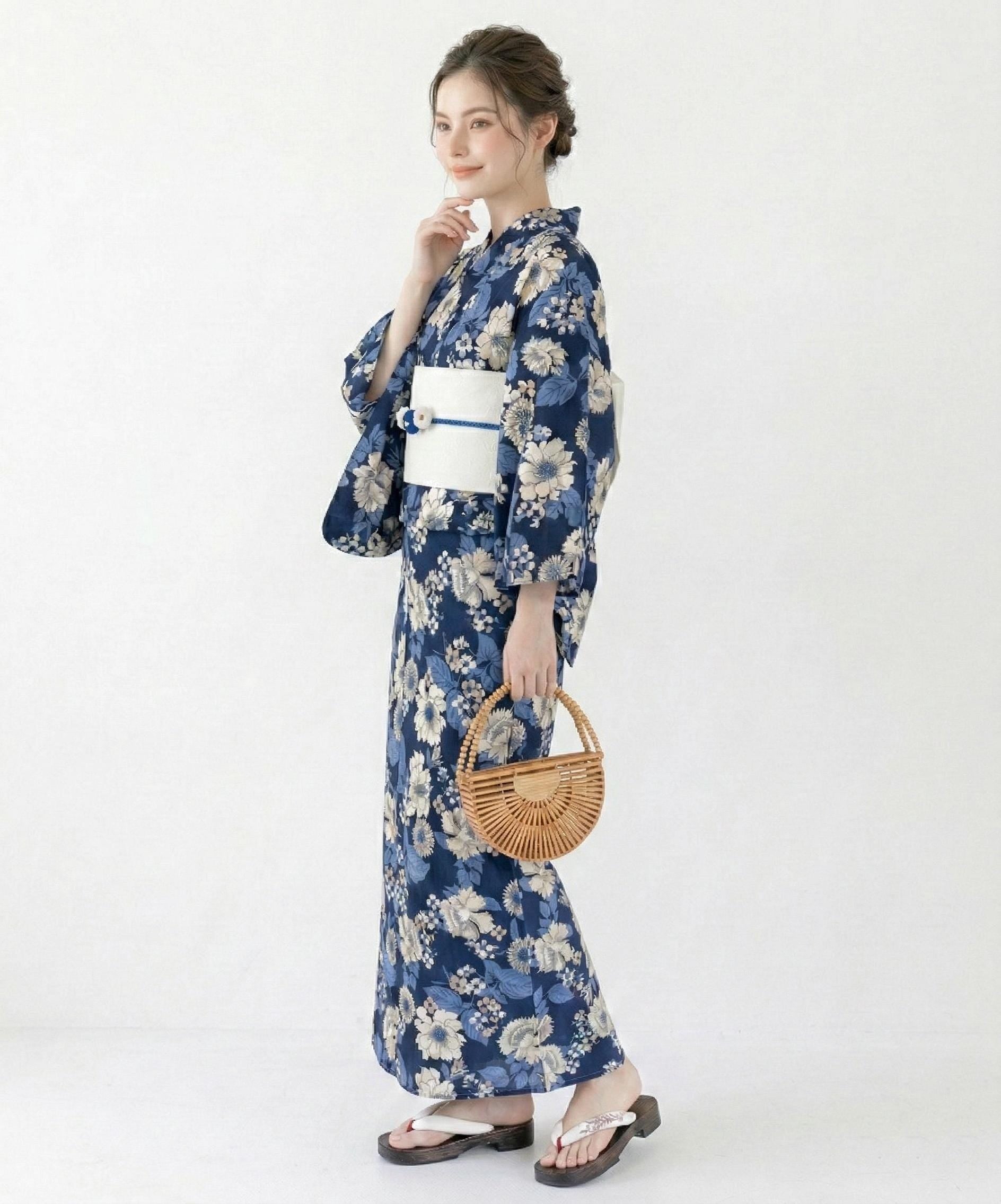 Navy Floral Cotton Yukata Set, Obi Belt & Sandals, Custom Fit Available
