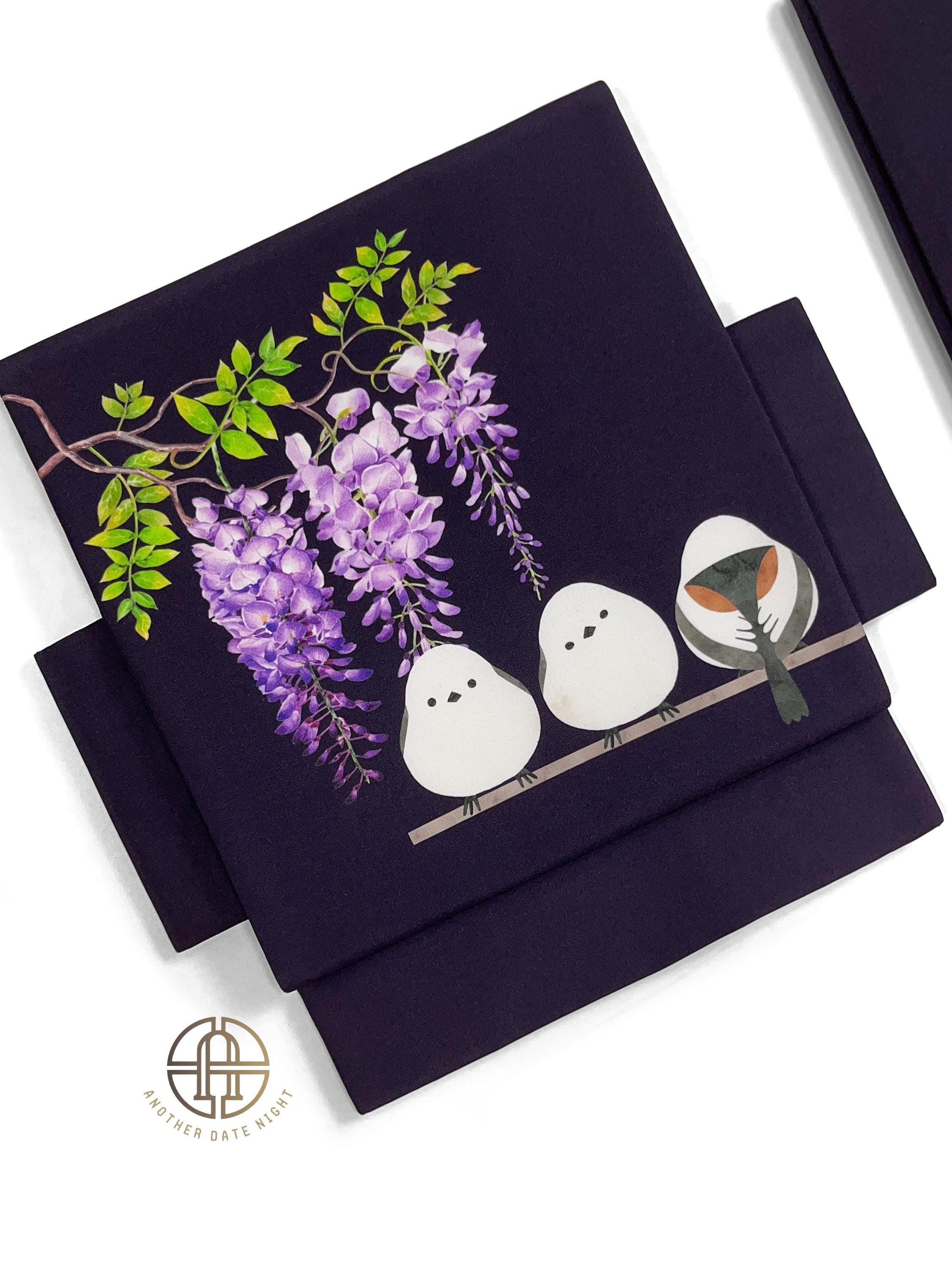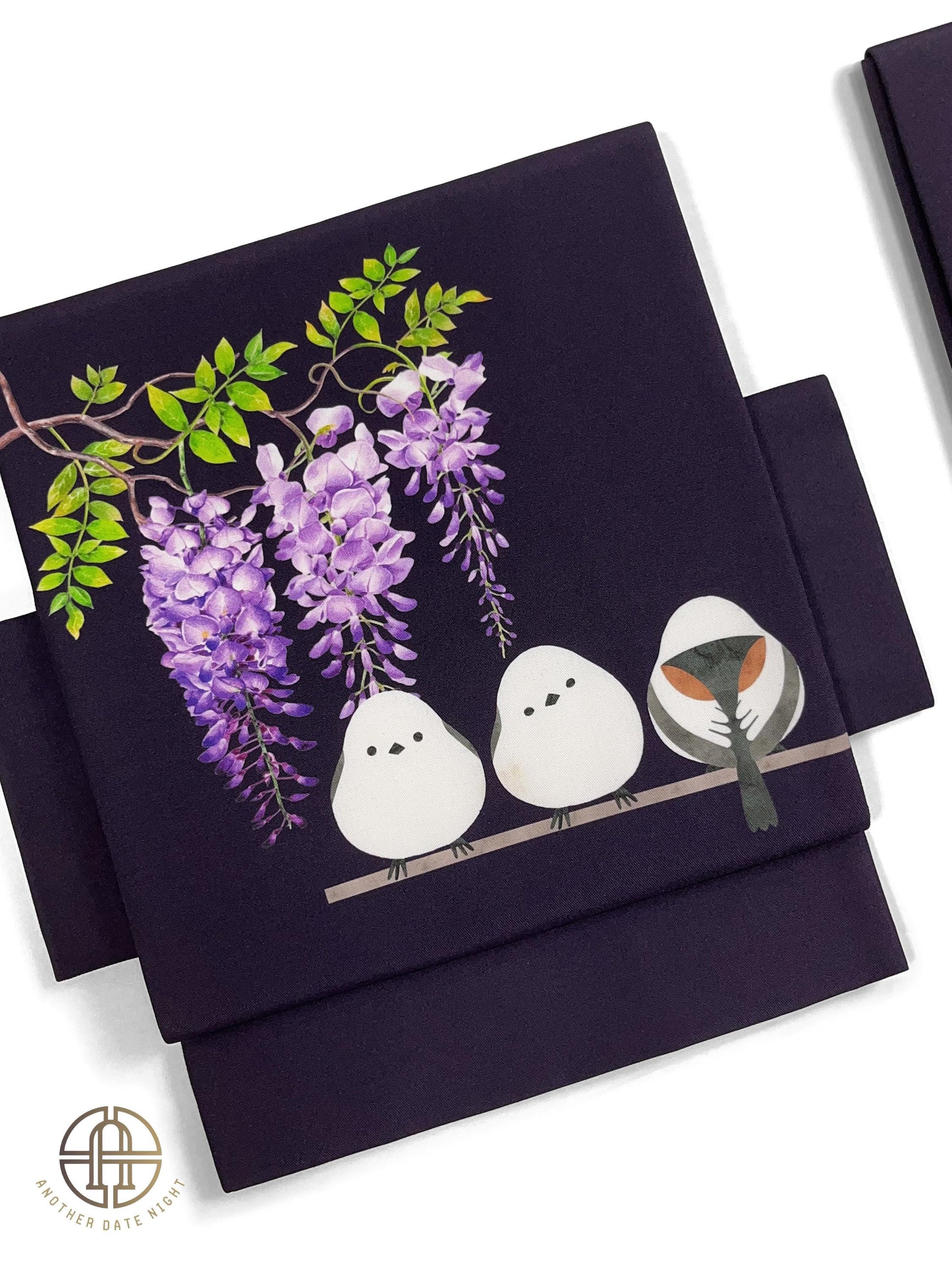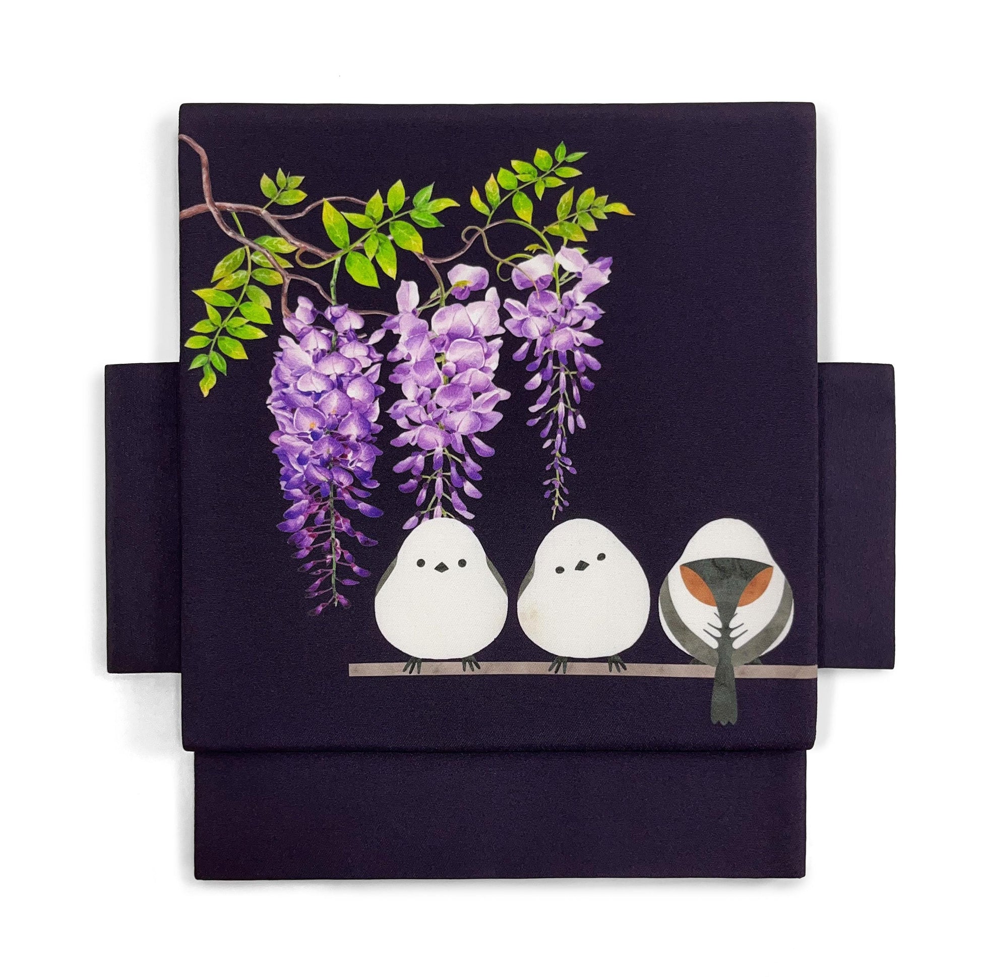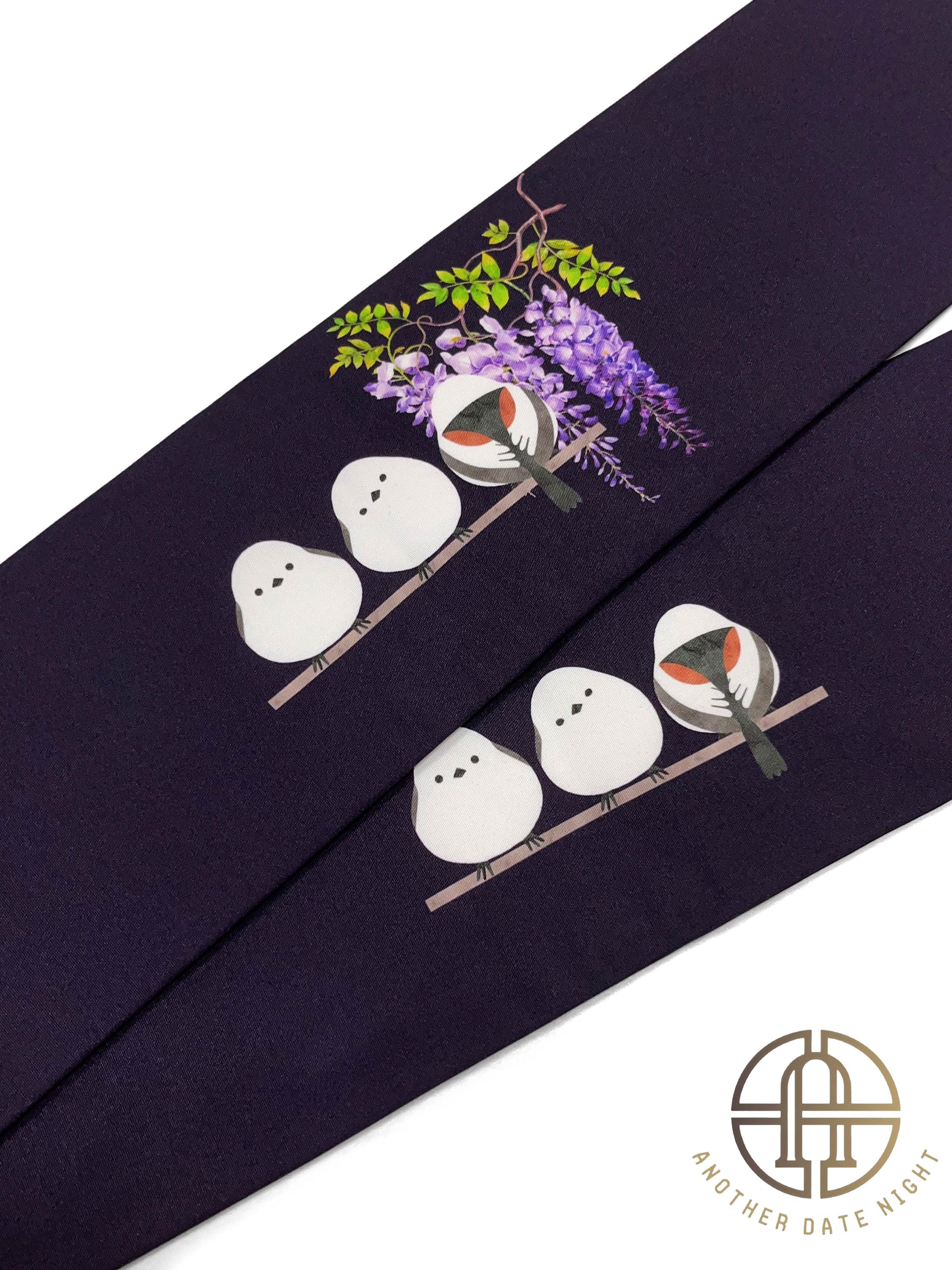 Purple Hokkaido Bird Pre-Tied Nagoya Obi, Easy Wear Taiko Knot, Long-tailed Tit (or Shima-enaga)