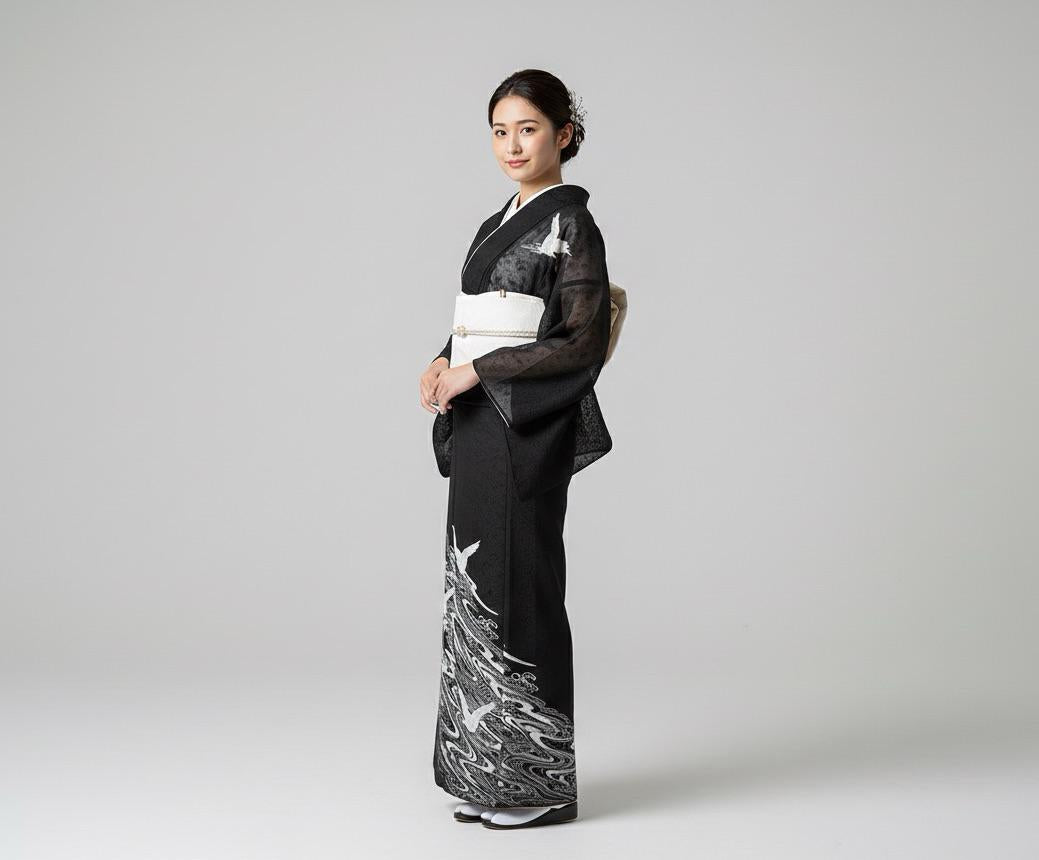 **The first two photos are AI-generated to provide a visual estimate of how the kimono looks when worn. These images illustrate the elegant drape of the fabric and how the sheer layers appear on the body.