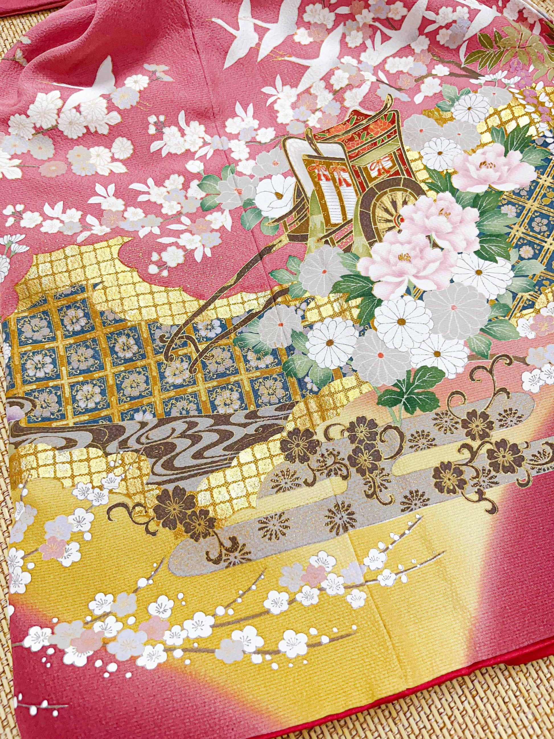 Vintage Pink Silk Furisode Kimono: Crane & Royal Carriage, Rank A+ (B30)